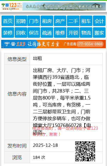 出租厂房、大厅、门市;河渠镇西行393省道路北,临街好位置,一层可以隔成两间门市,共283平;二、三层各800平,每平米承重1.5吨,可当库房,有货梯,一二三层都带双卫生间,门前方便停放多辆车,也可办做婚宴大厅15076860728 【电话咨询时,请一定说明在宁晋123看到的,谢谢!】 |