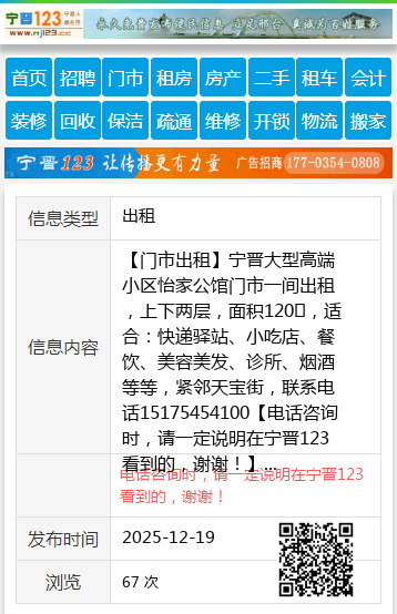 【门市出租】宁晋大型高端小区怡家公馆门市一间出租,上下两层,面积120㎡,适合:快递驿站、小吃店、餐饮、美容美发、诊所、烟酒等等,紧邻天宝街,联系电话15175454100 【电话咨询时,请一定说明在宁晋123看到的,谢谢!】 |