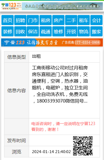 工商街移动公司对过月租房房东直租进门人脸识别,交通便利,空调,热水器,油烟机,电磁炉,独立卫生间,全自动洗衣机,免费无线,18003393070微信同号 【电话咨询时,请一定说明在宁晋123看到的,谢谢!】 |