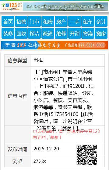【门市出租】宁晋大型高端小区怡家公馆门市一间出租,上下两层,面积120㎡,适合:服装、快递驿站、诊所、小吃店、餐饮、美容美发、烟酒等等,紧邻天宝街,联系电话15175454100 【电话咨询时,请一定说明在宁晋123看到的,谢谢!】 |