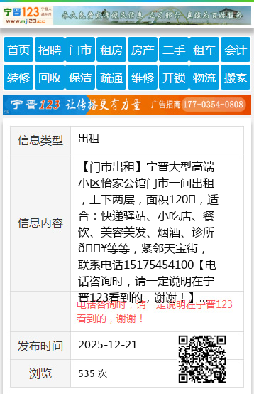 【门市出租】宁晋大型高端小区怡家公馆门市一间出租,上下两层,面积120㎡,适合:快递驿站、小吃店、餐饮、美容美发、烟酒、诊所🏥等等,紧邻天宝街,联系电话15175454100 【电话咨询时,请一定说明在宁晋123看到的,谢谢!】 |