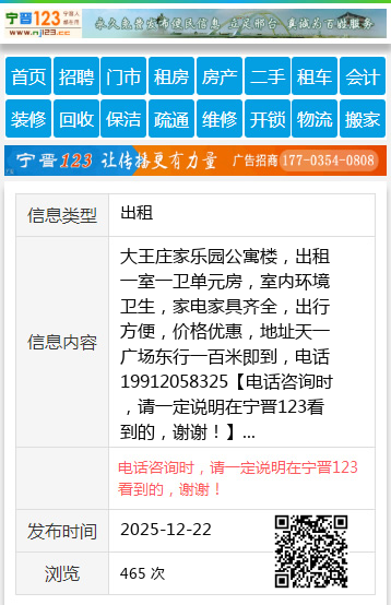大王庄家乐园公寓楼,出租一室一卫单元房,室内环境卫生,家电家具齐全,出行方便,价格优惠,地址天一广场东行一百米即到,电话19912058325 【电话咨询时,请一定说明在宁晋123看到的,谢谢!】 |