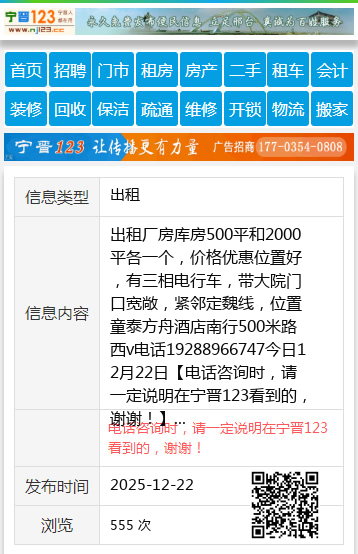出租厂房库房500平和2000平各一个,价格优惠位置好,有三相电行车,带大院门口宽敞,紧邻定魏线,位置童泰方舟酒店南行500米路西v电话19288966747今日12月22日 【电话咨询时,请一定说明在宁晋123看到的,谢谢!】 |
