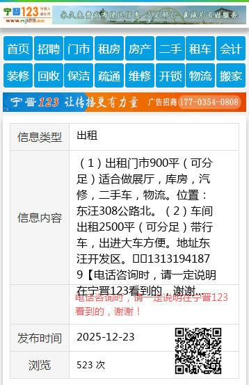 (1)出租门市900平(可分足)适合做展厅,库房,汽修,二手车,物流。位置:东汪308公路北。(2)车间出租2500平(可分足)带行车,出进大车方便。地址东汪开发区。☎️13131941879 【电话咨询时,请一定说明在宁晋123看到的,谢谢!】 |