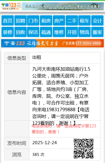 九河大街南环加油站南行1.5公里处,周围无居民;户外拓展、适合养殖、小型加工厂等,场地共约3亩(厂房、库房、院、办公室、独立水电),可合作可出租,有意向来电19831799888 【电话咨询时,请一定说明在宁晋123看到的,谢谢!】 |
