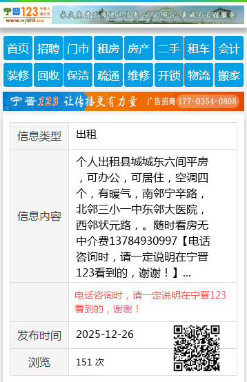 个人出租县城城东六间平房,可办公,可居住,空调四个,有暖气,南邻宁辛路,北邻三小一中东邻大医院,西邻状元路,。随时看房无中介费13784930997 【电话咨询时,请一定说明在宁晋123看到的,谢谢!】 |