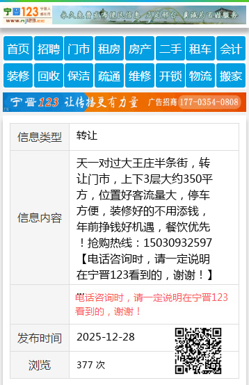 天一对过大王庄半条街,转让门市,上下3层大约350平方,位置好客流量大,停车方便,装修好的不用添钱,年前挣钱好机遇,餐饮优先!抢购热线:15030932597 【电话咨询时,请一定说明在宁晋123看到的,谢谢!】 |