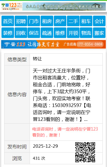 天一对过大王庄半条街,门市出租客流量大,位置好,租金合适,门前地宽敞,好停车,上下3层大约350平,门头宽,欢迎实地考察!联系电话:15030932597 【电话咨询时,请一定说明在宁晋123看到的,谢谢!】 |