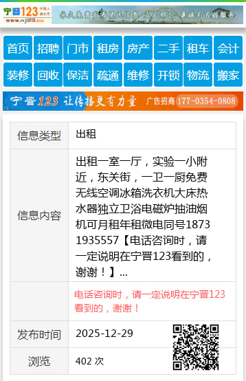 出租一室一厅,实验一小附近,东关街,一卫一厨免费无线空调冰箱洗衣机大床热水器独立卫浴电磁炉抽油烟机可月租年租微电同号18731935557 【电话咨询时,请一定说明在宁晋123看到的,谢谢!】 |