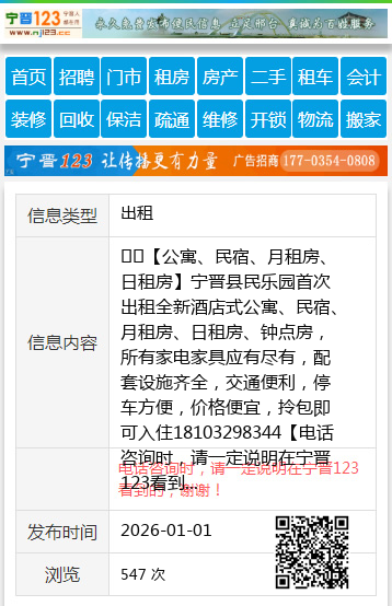☎️【公寓、民宿、月租房、日租房】宁晋县民乐园首次出租全新酒店式公寓、民宿、月租房、日租房、钟点房,所有家电家具应有尽有,配套设施齐全,交通便利,停车方便,价格便宜,拎包即可入住18103298344 【电话咨询时,请一定说明在宁晋123看到的,谢谢!】 |