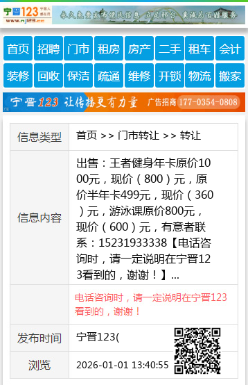 出售:王者健身年卡原价1000元,现价(800)元,原价半年卡499元,现价(360)元,游泳课原价800元,现价(600)元,有意者联系:15231933338 【电话咨询时,请一定说明在宁晋123看到的,谢谢!】 |
