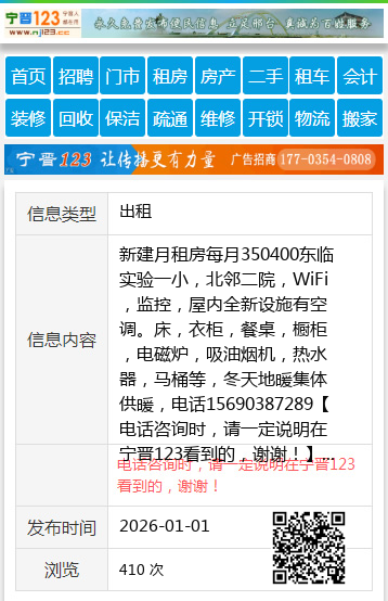 新建月租房每月350400东临实验一小,北邻二院,WiFi,监控,屋内全新设施有空调。床,衣柜,餐桌,橱柜,电磁炉,吸油烟机,热水器,马桶等,冬天地暖集体供暖,电话15690387289 【电话咨询时,请一定说明在宁晋123看到的,谢谢!】 |