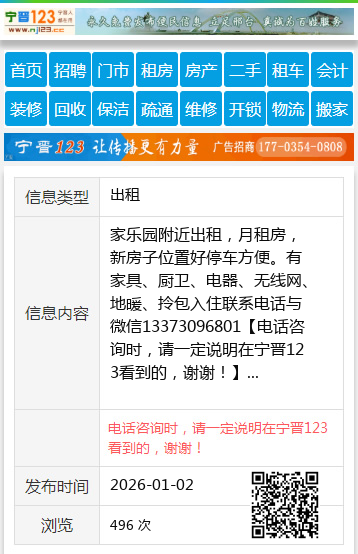 家乐园附近出租,月租房,新房子位置好停车方便。有家具、厨卫、电器、无线网、地暖、拎包入住联系电话与微信13373096801