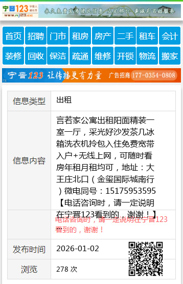 言若家公寓出租阳面精装一室一厅,采光好沙发茶几冰箱洗衣机拎包入住免费宽带入户+无线上网,可随时看房年租月租均可,地址:大王庄北口(金玺国际城南行)微电同号:15175953595 【电话咨询时,请一定说明在宁晋123看到的,谢谢!】 |