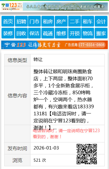 整体转让颐和明珠商圈熟食店,上下两层,整体面积70多平,1个全新熟食展示柜,三个冷藏冷冻柜,850烤鸭炉一个,空调两个,热水器都有,有兴趣来看店18333913181 【电话咨询时,请一定说明在宁晋123看到的,谢谢!】 |