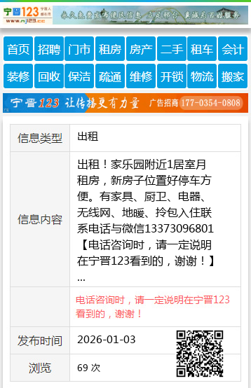 出租!家乐园附近1居室月租房,新房子位置好停车方便。有家具、厨卫、电器、无线网、地暖、拎包入住联系电话与微信13373096801 【电话咨询时,请一定说明在宁晋123看到的,谢谢!】 |