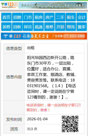 阳光怡园西边新开公路,路东门市30平方,一层出租,位置好,适合办公、直播、家政工作室、烟酒店、教辅、美容美发等。联系电话:18031901568。(1.4) 【电话咨询时,请一定说明在宁晋123看到的,谢谢!】 |