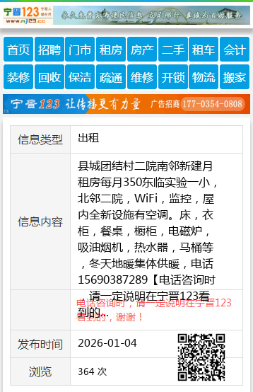 县城团结村二院南邻新建月租房每月350东临实验一小,北邻二院,WiFi,监控,屋内全新设施有空调。床,衣柜,餐桌,橱柜,电磁炉,吸油烟机,热水器,马桶等,冬天地暖集体供暖,电话15690387289 【电话咨询时,请一定说明在宁晋123看到的,谢谢!】 |