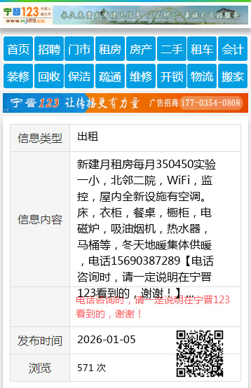新建月租房每月350450实验一小,北邻二院,WiFi,监控,屋内全新设施有空调。床,衣柜,餐桌,橱柜,电磁炉,吸油烟机,热水器,马桶等,冬天地暖集体供暖,电话15690387289 【电话咨询时,请一定说明在宁晋123看到的,谢谢!】 |
