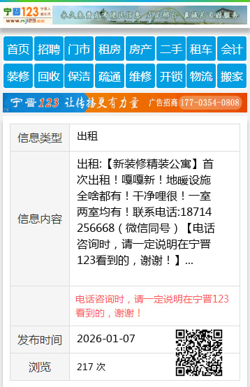出租:【新装修精装公寓】首次出租!嘎嘎新!地暖设施全啥都有!干净哩很!一室两室均有!联系电话:18714256668(微信同号) 【电话咨询时,请一定说明在宁晋123看到的,谢谢!】 |