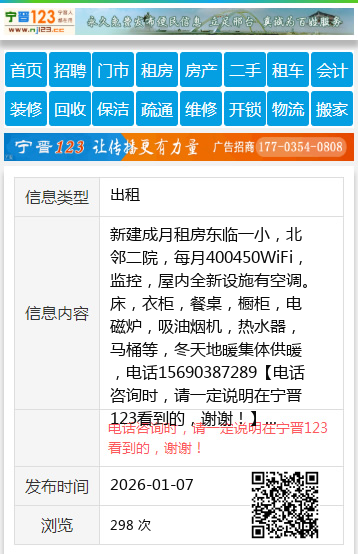 新建成月租房东临一小,北邻二院,每月400450WiFi,监控,屋内全新设施有空调。床,衣柜,餐桌,橱柜,电磁炉,吸油烟机,热水器,马桶等,冬天地暖集体供暖,电话15690387289 【电话咨询时,请一定说明在宁晋123看到的,谢谢!】 |
