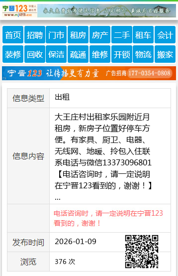大王庄村出租家乐园附近月租房,新房子位置好停车方便。有家具、厨卫、电器、无线网、地暖、拎包入住联系电话与微信13373096801 【电话咨询时,请一定说明在宁晋123看到的,谢谢!】 |
