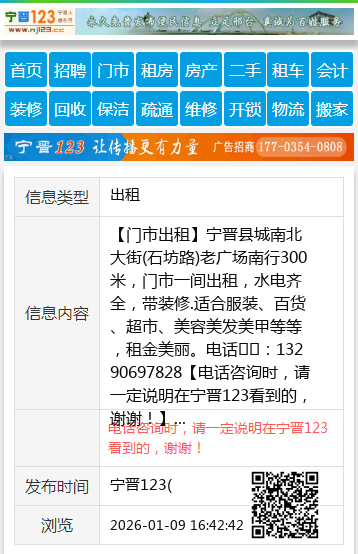 【门市出租】宁晋县城南北大街(石坊路)老广场南行300米,门市一间出租,水电齐全,带装修.适合服装、百货、超市、美容美发美甲等等,租金美丽。电话☎️:13290697828 【电话咨询时,请一定说明在宁晋123看到的,谢谢!】 |