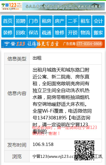 出租月城路天和城东路口附近公寓、新二院南、房东直租,全阳面宽敞明亮房间有独立卫生间全自动洗衣机热水器,厨房带橱柜抽油烟机有空调地暖舒适大床衣柜。全屋Wi-Fi覆盖,电话微信同号13473081895 【电话咨询时,请一定说明在宁晋123看到的,谢谢!】 |