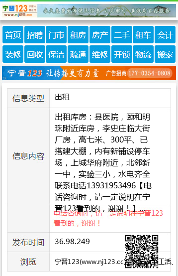 出租库房:县医院,颐和明珠附近库房,李史庄临大街厂房,高七米、300平、已搭建大棚,内有新铺设停车场,上城华府附近,北邻新一中,实验三小,水电齐全联系电话13931953496 【电话咨询时,请一定说明在宁晋123看到的,谢谢!】 |