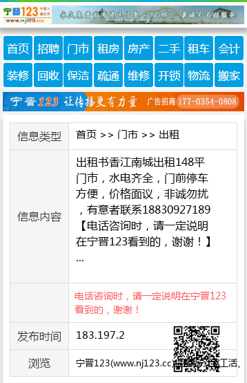 出租书香江南城出租148平门市,水电齐全,门前停车方便,价格面议,非诚勿扰,有意者联系18830927189 【电话咨询时,请一定说明在宁晋123看到的,谢谢!】 |