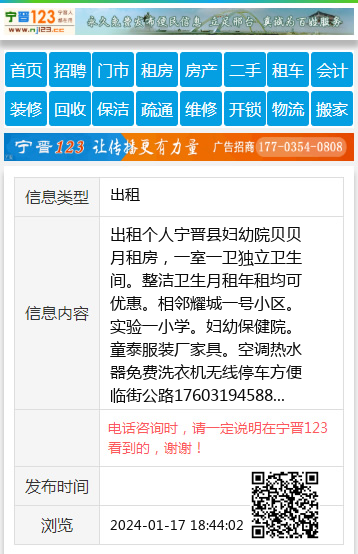 出租个人宁晋县妇幼院贝贝月租房,一室一卫独立卫生间。整洁卫生月租年租均可优惠。相邻耀城一号小区。实验一小学。妇幼保健院。童泰服装厂家具。空调热水器免费洗衣机无线停车方便临街公路17603194588 【电话咨询时,请一定说明在宁晋123看到的,谢谢!】 |