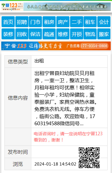 出租宁晋县妇幼院贝贝月租房,一室一卫,整洁卫生,月租年租均可优惠!相邻实验一小学,妇幼保健院,童泰服装厂。家具空调热水器。免费洗衣机无线。停车方便,临街公路。欢迎致电,17603194588微信同号 【电话咨询时,请一定说明在宁晋123看到的,谢谢!】 |
