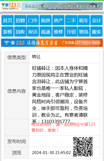 旺铺转让:因本人身体和精力原因现将正在营业的旺铺含泪转让,此店铺为宁晋首家也是唯一一家私人影院,黄金地段,客户稳定,装修风格时尚引领潮流,设备齐全,接手即可盈利,负责培训,教会为止。有意者请联系:13103391777 【电话咨询时,请一定说明在宁晋123看到的,谢谢!】 |