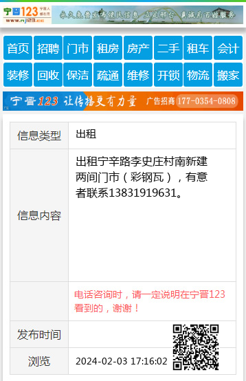 出租宁辛路李史庄村南新建两间门市(彩钢瓦),有意者联系13831919631。