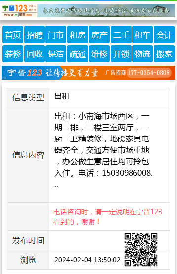 出租:小南海市场西区,一期二排,二楼三室两厅,一厨一卫精装修,地暖家具电器齐全,交通方便市场重地,办公做生意居住均可拎包入住。电话:15030986008 【电话咨询时,请一定说明在宁晋123看到的,谢谢!】 |