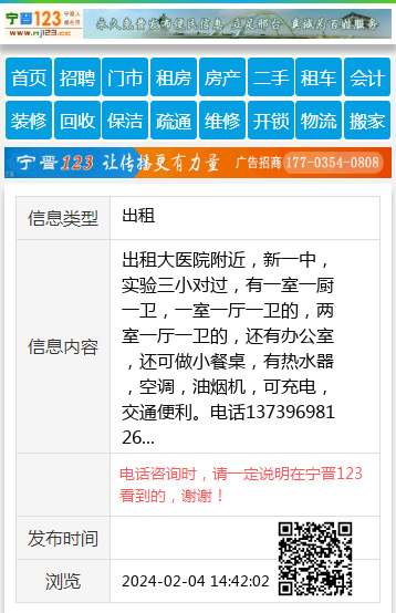 出租大医院附近,新一中,实验三小对过,有一室一厨一卫,一室一厅一卫的,两室一厅一卫的,还有办公室,还可做小餐桌,有热水器,空调,油烟机,可充电,交通便利。电话13739698126 【电话咨询时,请一定说明在宁晋123看到的,谢谢!】 |