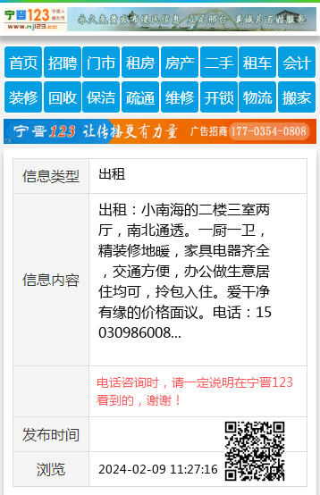 出租:小南海的二楼三室两厅,南北通透。一厨一卫,精装修地暖,家具电器齐全,交通方便,办公做生意居住均可,拎包入住。爱干净有缘的价格面议。电话:15030986008 【电话咨询时,请一定说明在宁晋123看到的,谢谢!】 |