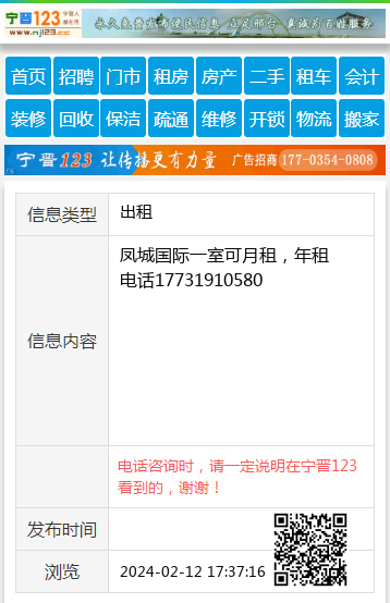 凤城国际一室可月租,年租电话17731910580