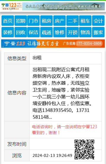 出租现二院附近公寓式月租房新房内设双人床,衣柜变频空调,热水器,无线独立卫生间,地暖等,紧邻实验一小二院三小第一幼儿园环境安静拎包入住,价格实惠。电话13483935450。13731581148 【电话咨询时,请一定说明在宁晋123看到的,谢谢!】 |