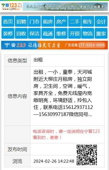 出租,一小,童泰,天河城附近大柳庄月租房,独立厨房,卫生间,空调,暖气,家具齐全,免费无线屋内宽敞明亮,环境舒适,拎包入住,联系电话15612937112—15630997187微信同号 【电话咨询时,请一定说明在宁晋123看到的,谢谢!】 |