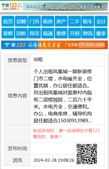 个人出租凤凰城一期新装修门市二楼,水电暖齐全,位置优越,办公居住都适合。另出租凤凰城对面果村内临街二层楼独院,二百六十平米。水电齐全,交通便利。办公,电商库房,辅导机构居住都适合15030913989 【电话咨询时,请一定说明在宁晋123看到的,谢谢!】 |
