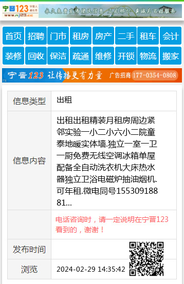 出租出租精装月租房周边紧邻实验一小二小六小二院童泰地暖实体墙.独立一室一卫一厨免费无线空调冰箱单屋配备全自动洗衣机大床热水器独立卫浴电磁炉抽油烟机.可年租.微电同号15530918881 【电话咨询时,请一定说明在宁晋123看到的,谢谢!】 |