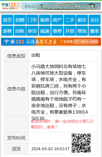 小马路大地饲料北有场地七八亩地可放大型设备,停车场,修车场,水电齐全,有彩钢瓦房三间,另有两个小院出租,出行方便。另南环路路南有个场地院子约有一亩多地出租,没有房子,水电齐全,有意者联系13001450130 【电话咨询时,请一定说明在宁晋123看到的,谢谢!】 |