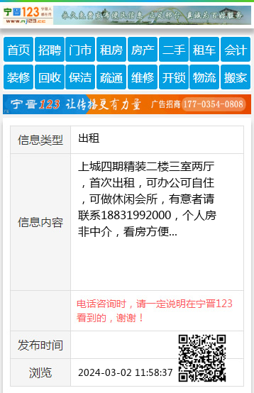 上城四期精装二楼三室两厅,首次出租,可办公可自住,可做休闲会所,有意者请联系18831992000,个人房非中介,看房方便 【电话咨询时,请一定说明在宁晋123看到的,谢谢!】 |