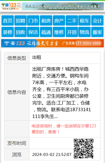 出租厂房库房!城西西华路附近,交通方便。钢构车间7米高,一千平左右,水电齐全,有三百平米小院,办公室,卫生间厨房都已装修完毕。适合:工厂加工,仓储,物流。联系电话18733141111李先生 【电话咨询时,请一定说明在宁晋123看到的,谢谢!】 |