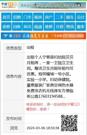 出租个人宁晋县妇幼院贝贝月租房,一室一卫独立卫生间。整洁卫生月租年租均可优惠。相邻耀城一号小区。实验一小学。妇幼保健院。童泰服装厂家具空调热水器免费洗衣机无线停车方便临街公路17603194588 【电话咨询时,请一定说明在宁晋123看到的,谢谢!】 |