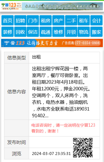 出租出租宁辉花园一楼,两室两厅,餐厅可做卧室。出租日期2023年4月18号后。年租12000元,押金2000元。空调两个,双人床两个,洗衣机,电热水器,抽油烟机,水电齐全联系电话18903191402 【电话咨询时,请一定说明在宁晋123看到的,谢谢!】 |