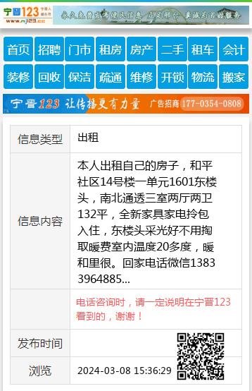 本人出租自己的房子,和平社区14号楼一单元1601东楼头,南北通透三室两厅两卫132平,全新家具家电拎包入住,东楼头采光好不用掏取暖费室内温度20多度,暖和里很。回家电话微信13833964885 【电话咨询时,请一定说明在宁晋123看到的,谢谢!】 |