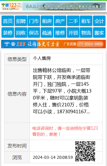 出售翰林公馆临街,一层带院带下跃,开发商承诺临街开门,独门独院,一层145平,下层97平,小院大概130平米,随时可以拿钥匙装修入住,售价210万,价格可以小谈,18730941167 【电话咨询时,请一定说明在宁晋123看到的,谢谢!】 |