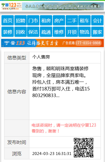 急售,颐和明珠两室精装修现房,全屋品牌家具家电。拎包入住,房本满五唯一,首付18万即可入住,电话15803290833 【电话咨询时,请一定说明在宁晋123看到的,谢谢!】 |
